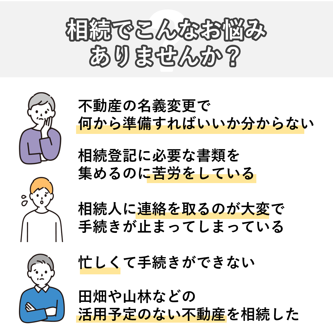 相続に関して、以下のようなことにお悩みではありませんか?