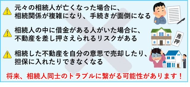 相続登記をしないと、将来、相続人同士のトラブルに繋がるため、早めの手続きが必要です!